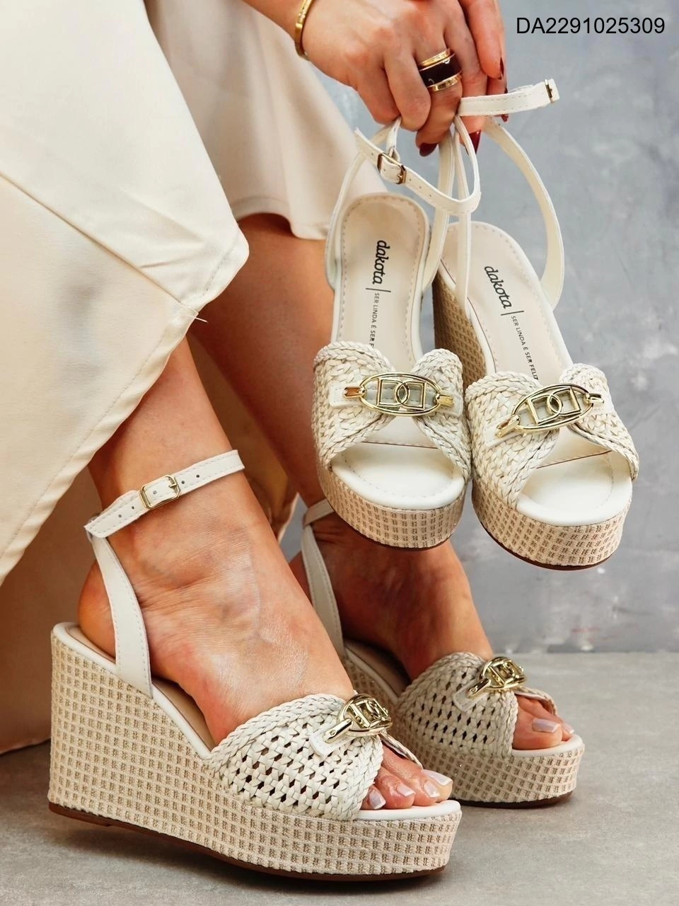 Com a Sandália Dakota Y9871, você investe na combinação perfeita de altura, segurança e um design com Trama de Charme que transformará seus looks de verão.