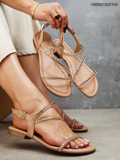 Versatilidade de Combinação: A cor neutra (Nude/Bege) e o brilho discreto do strass tornam-na fácil de combinar com vestidos, saias, shorts e calças de alfaiataria.
