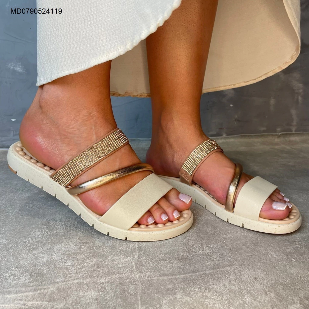 Sandália Flat Modare, confeccionada em material sintético com detalhe metalizado no cabedal e fácil calce, essa sandália é moderna, versátil e confortável, ideal para ocasiões casuais ou dia a dia. Coleção: Primavera/Verão 2025.