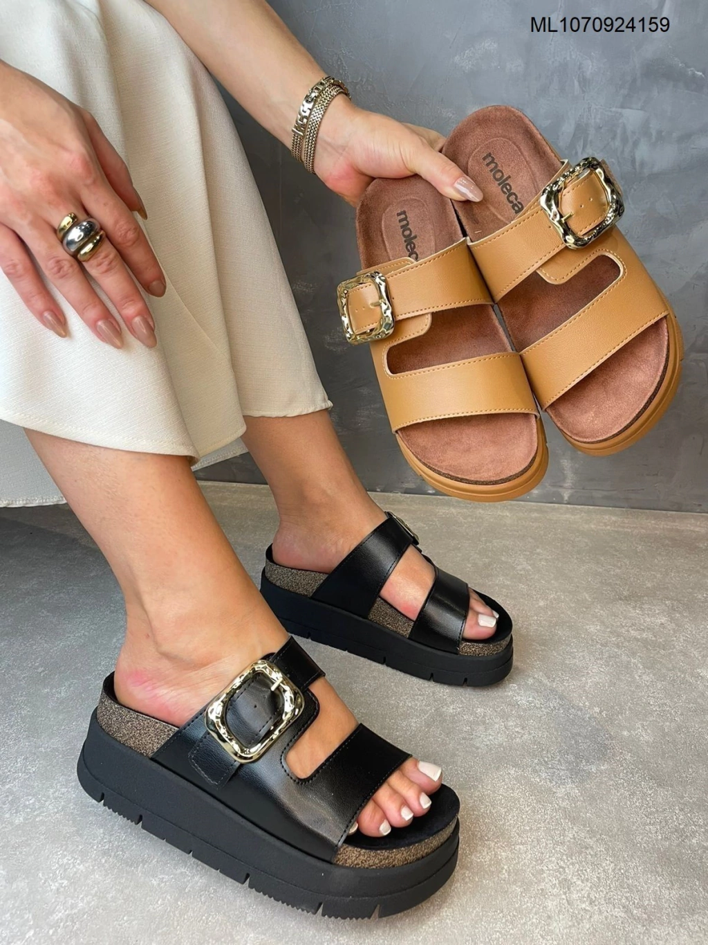 Detalhes: Fivela de metal dourado, tiras largas cruzadas no peito do pé, palmilha macia e confortável, solado antiderrapante.
